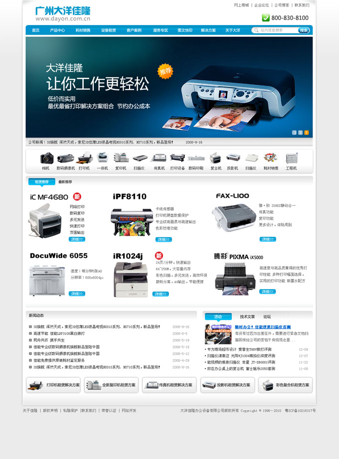 ???? 廣州大洋佳隆辦公設(shè)備有限公司是一家辦公設(shè)備銷售、維修、租賃的專業(yè)機(jī)構(gòu),是日本佳能公司在華南地區(qū)最大的綜合型佳能經(jīng)銷商,是佳能公司認(rèn)定的佳能廣州地區(qū)分銷商、佳能五星級(jí)維修站、佳能中國(guó)最大零配件中心、佳能復(fù)印機(jī)租賃中心。公司現(xiàn)有員工150余人,其中工程技術(shù)人員75人,36人取得佳能星級(jí)技術(shù)認(rèn)證,其中2位工程師獲佳能全球最高技術(shù)認(rèn)證:佳能五星級(jí)技術(shù)證書(shū)。具有彩色復(fù)印機(jī)、大型數(shù)碼復(fù)印機(jī)、工程復(fù)印機(jī)、工程曬圖機(jī)、繪圖儀等超大型辦公設(shè)備的銷售、維修及技術(shù)支持能力。同時(shí)大洋佳隆也是理光復(fù)印機(jī)、傳真機(jī),施樂(lè)復(fù)印機(jī)、工程復(fù)印機(jī)、傳真機(jī),理想一體油印機(jī),KIP工程復(fù)印機(jī)等品牌的指定經(jīng)銷商。