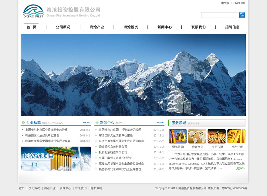 項目名稱:海滄投資控股有限公司網站建設簽定日期:2011年9月1日公司網址:http://www.oceanfirst.ca/首頁設計效果:(縮略圖)...