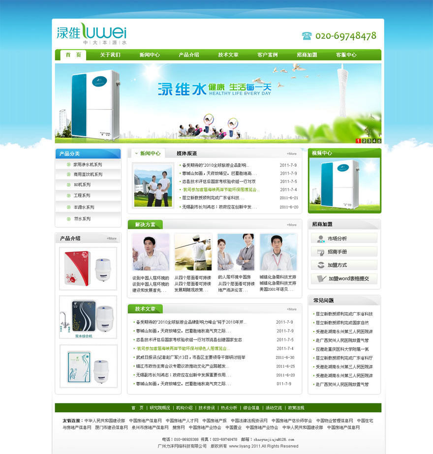 網站首頁設計稿:(縮略圖)公司簡介: 廣州淥維水處理設備有限公司、廣州中大生化科技有限公司在中山大學企業平臺上專業研發水處理設備多年。依托中山大學的科技實力,針對越來越嚴重的水污染情況,開發出一系列“淥維”牌家用和商用凈水設備。產品投放市場以來,深受百姓歡迎。獲廣東省保健行業協p授予“2011年度廣東省健康產業最受歡迎健康飲用水機”稱號。