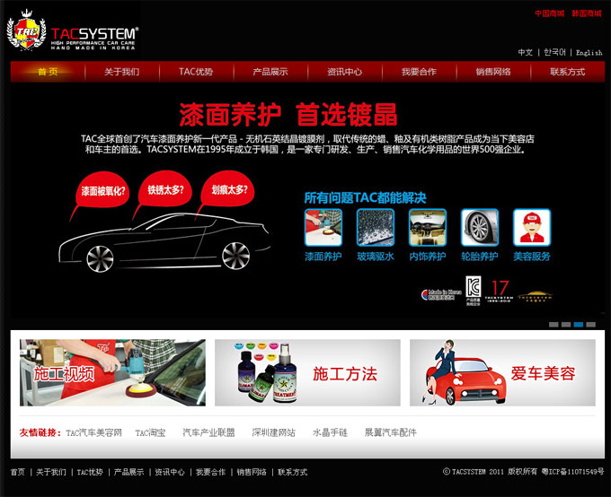 TACSYSTEM 1995年成立于韓國SOONCHUN,是一家專門研發、生產、銷售汽車美容用品的綜合性企業。主要生產和經營汽車漆面養護和汽車全系列美容產品,是全球第一家生產漆面無機結晶鍍膜的廠家。