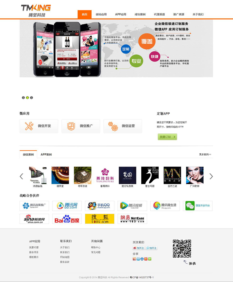 廣州騰堅信息科技有限公司,是一家專業從事于移動互聯網產品開發的高新科技企業,旨在幫助企業、個人能簡單、快速、廉價、高效地建設自己滿意的移動營銷平臺,輕松涉足移動互聯網,把握未來。是國內領先的在線應用開發平臺,提供自建、定制、發布、管理一站式服務。通過SaaS模式(軟件即服務的模式)向用戶提供服務,大大降低了應用的開發、維護成本,同時通過一次開發全平臺(IOS/Android/手機網站)適配的創新技術,大大提升了開發效率。本公司管理層曾任職于各大互聯網公司:騰訊、百度、新浪等有著廣泛的合作。