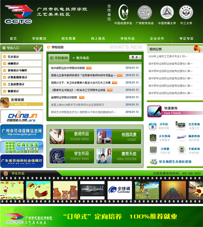 項(xiàng)目名稱:廣州機(jī)電技師學(xué)院工藝美術(shù)校區(qū)網(wǎng)站建設(shè)簽定日期:2010年3月9日網(wǎng)站首頁效果:...